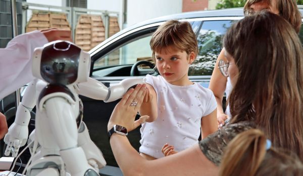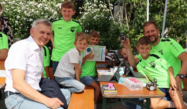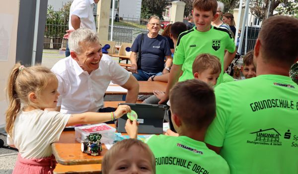Bürgermeister Dr. Heiko Voigt zeigte sich beeindruckt von der großen Zahl an Ausstellern. Beim Besuch der Grundschule Oberlind erhielt er Einblicke in das Thema Programmierung. Sein Fazit: „Solche Angebote müsste es an jeder Grundschule geben.“