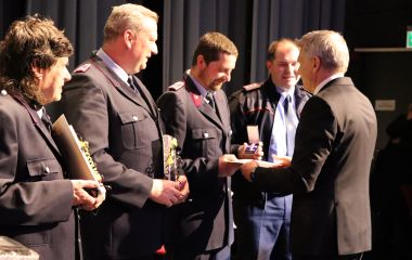 Für die Feuerwehrkameraden gab es ebenfalls wie üblich eine Auszeichnung: Für 25 Jahre Dienstzeit in der Freiwilligen Feuerwehr wurden mit der Silbernen Brandschutzmedaille Dominic Liebermann (FF Sbg.-Hüttengrund), Matthias Schuch (FF Sbg.-Hüttengrund), Marcel Steiner (FF Sbg.-Oberlind) und Rainer Wachter (FF Sbg.-Hüttengrund) geehrt. Für 50-jährige Mitgliedschaft Peter Gernlein (FF Sbg.-Hüttengrund) und sage und schreibe 60 Jahre in der Feuerwehr hat Karl-Heinz Zacharie (FF Sbg.-Oberlind) hinter sich.