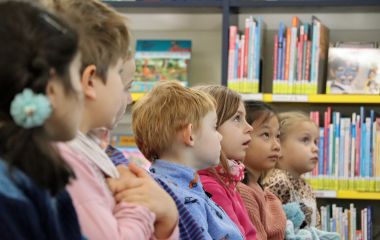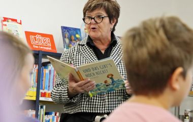 Zu den ersten Besuchern gehörten am Freitagvormittag die Zweitklässler der Grundschule „Geschwister Scholl“, die erstmals durch das neue Entree hereinkamen. Sie nutzten den bundesweiten Vorlesetag für eine Vorlesestunde mit der Ehrenamtlichen Beigeordneten Doris Motschmann. Sie las aus dem Kinderbuch „Und das gibt’s noch nicht?“ vor. Darin erfinden Achille und seine Schwester Salomé „die besten Berufe der Welt“, wie zum Beispiel Witzekosterinnen oder Klimaerfrischer. Eine heitere, kindliche Geschichte, die auch die Scholl-Schüler zum fantasievollen Austausch anregte.