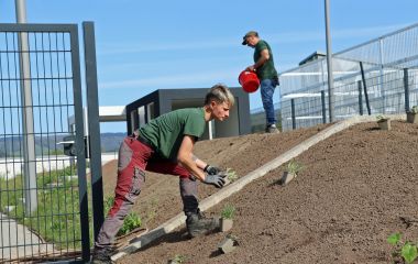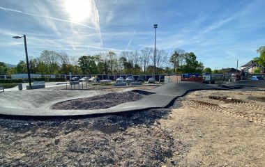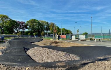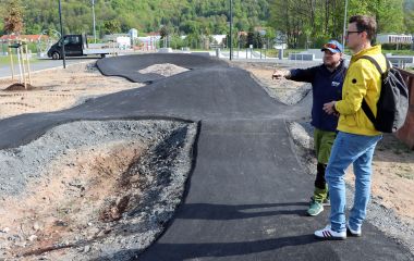 Der neue Pump-Track – ein kurvenreiche, hügelige Mountainbike-Strecke – ist frisch asphaltiert und muss noch entsprechend eingebettet werden. Der Bagger ist noch in Aktion, die Bauarbeiter setzen Randsteine und Zaunelemente und eine Gartenbaufirma pflanzt die bisher noch unangetasteten Flächen mit Stauden, Gräsern und Blumen an. Auf die Betonteile für die Kletterwand wird derzeit noch gewartet.