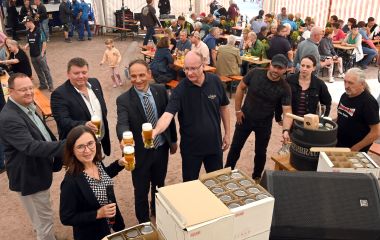 Zum Auftakt des Abends gab es nach dem ersten Fassbieranstich zur Vogelschießen-Eröffnung nun einen zweiten für den Handwerkerabend durch Kreishandwerksmeister Mario Hähnlein und Mike Bätz von der Privatbrauerei Gessner, der sich um den fachgerechten Ausschank kümmerte.
