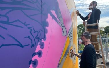 Während sich auf der nach außen gewölbten Seite, die Richtung Parkplatz und Café Isis zeigt, farbenfrohe wetterfeste Holz-/Kunststoffplatten aneinanderreihen, bekam die Innenseite im September gezielte Sprühstöße aus der Dose. Ein zuvor mit der Stadt Sonneberg abgestimmtes Graffito wurde von drei professionellen Sprayern aus dem Nachbarlandkreis Saalfeld-Rudolstadt angebracht. Eine knappe Woche waren Simon, Bert und Klemens vor Ort, um die Themen des Jugendareals zu verbildlichen.