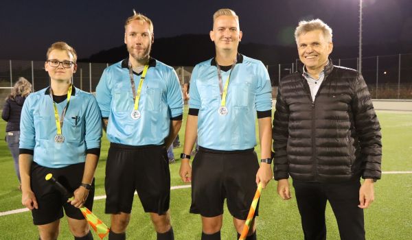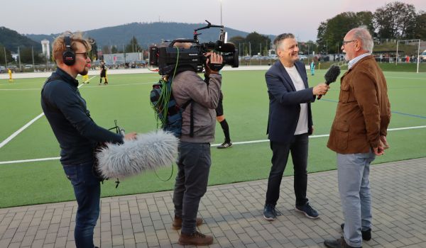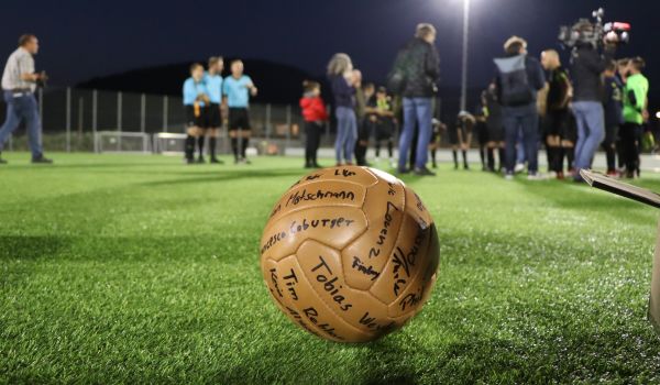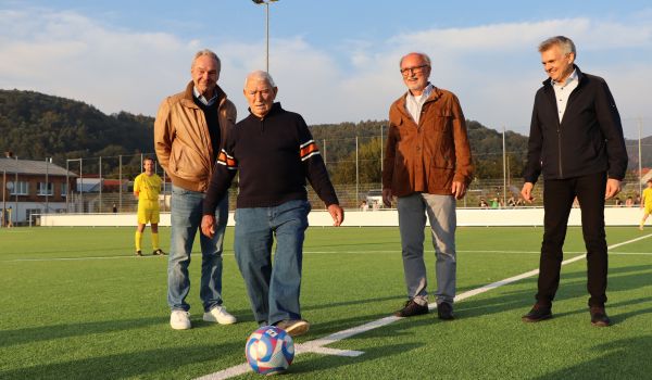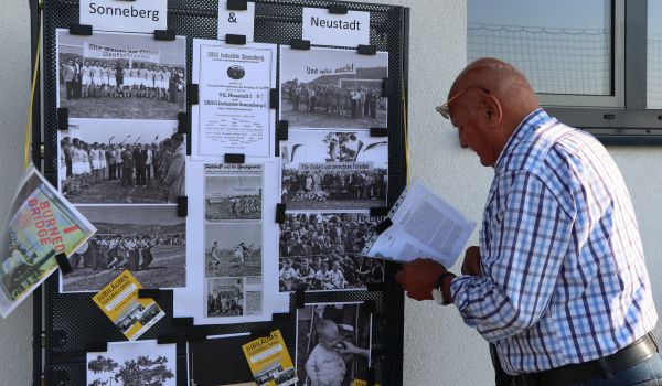 Zum Ehrenanstoß wurden zwei Nachfahren der damaligen Spielergeneration gewürdigt – Dieter Althans (Sonneberg und Sohn von Fußballer Günter Althans) sowie Erich Bauer (Neustadt und Sohn von Fußballer Atze Bauer) standen zum Anpfiff der Partie bei bestem Spätsommerwetter im Rampenlicht.