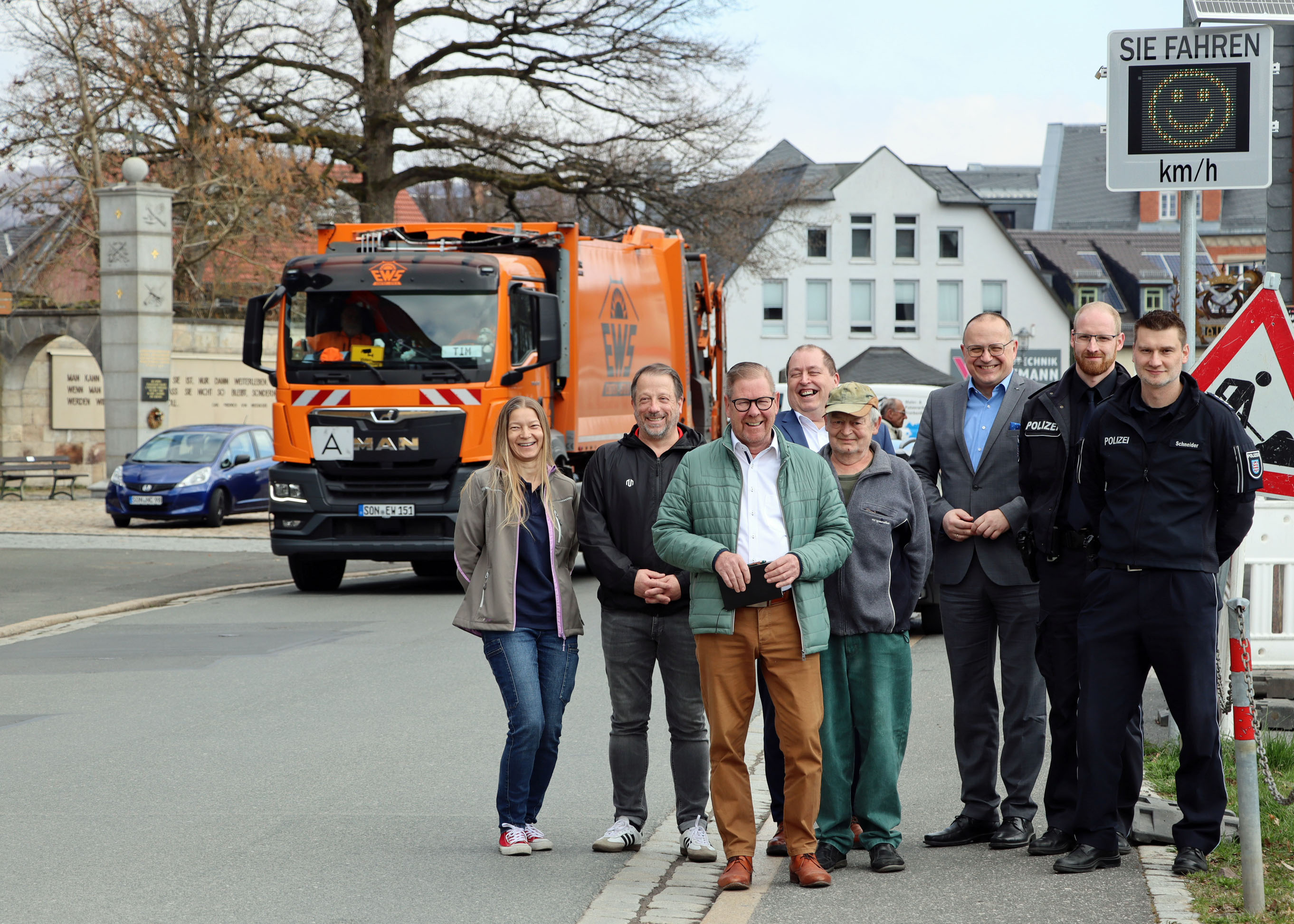 Großer Bahnhof am Donnerstag, 27. März 2025, in Oberlind: Ortsteilbürgermeister Ralf Wöhner hatte Vertreter der Polizeiinspektion Sonneberg, der VR-Bank Coburg und Sonneberg, der Stadtverwaltung sowie Mitglieder des Ortsteilrates eingeladen, um eine neue Radargeschwindigkeitsanzeigetafel in der 30er-Zone „An der Müß“ offiziell in Betrieb zu nehmen.