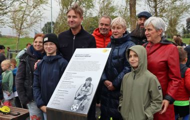 Gemeinsam mit Häfners Sohn Martin aus Dresden lupfte der Bürgermeister das gelbe Sonneberg-Trikot mit der Nummer 6 von der Infotafel. „Meinem Vater hätte das sehr gefallen“, sagte Häfners Sohn Martin kurz nach der Enthüllung. Die Familie versammelte sich noch für ein Gruppenfoto um die Stele, die Schritt für Schritt um weitere Sonneberger Olympiasieger ergänzt werden soll.
