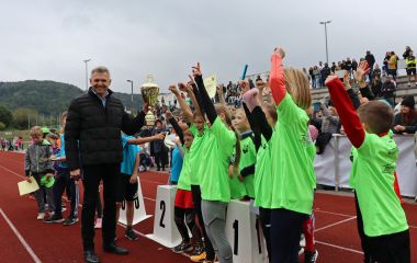 Bürgermeister Voigt tauschte nur Momente später das Mikrofon gegen die Startpistole und gab im Reinhard-Häfner-Sportfeld das Zeichen für den Staffellauf der Grundschulen. Sieben Mannschaften hatten sich eingefunden und wetteiferten um den Pokal des Bürgermeisters. In einem packenden Rennen setzten sich die Grundschüler aus Oberlind durch, die vor den Mädchen und Jungen der Grundschule Geschwister Scholl und vor den Föritztalern die Ziellinie überquerten. Die weiteren Platzierungen erreichten die Grundschulen Wolkenrasen, Grube, Schalkau und Rauenstein.
