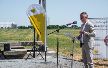 Sonnebergs Bürgermeister Dr. Heiko Voigt betonte in seinem Redebeitrag die wirtschaftliche und strategische Bedeutung des entstehenden Industriegebietes: „Heute setzen wir den etwas anderen Spatenstich und geben damit ein Versprechen für die wirtschaftliche Zukunft unserer Stadt und unserer gesamten Region.“ Dies konnte der Hauptgeschäftsführer der IHK Südthüringen Dr. Ralf Pieterwas nur unterstreichen: Er nannte die Erschließung eine „verdammt große Hausnummer“. „Dieses Industriegebiet wird Sogwirkung haben für Hoch- und Zukunftstechnologien, soll aber auch den gesamten Wirtschaftsraum erfassen. Der Ruf nach Fläche wird eines Tages alles überstrahlen“, prognostizierte Pieterwas.