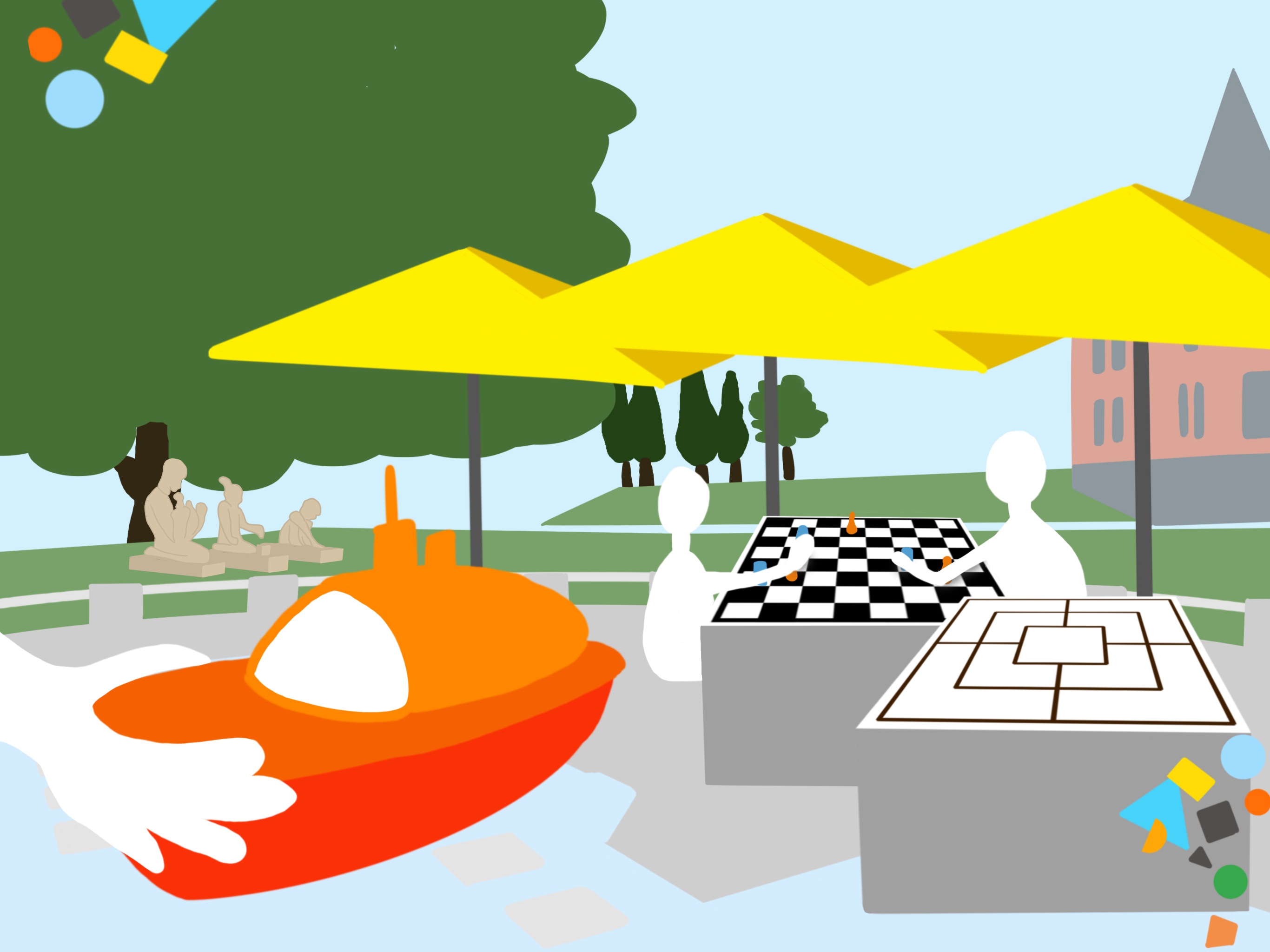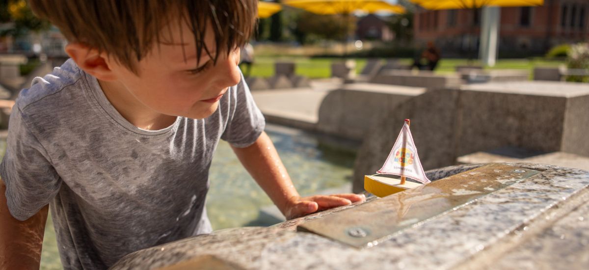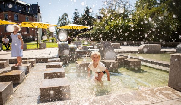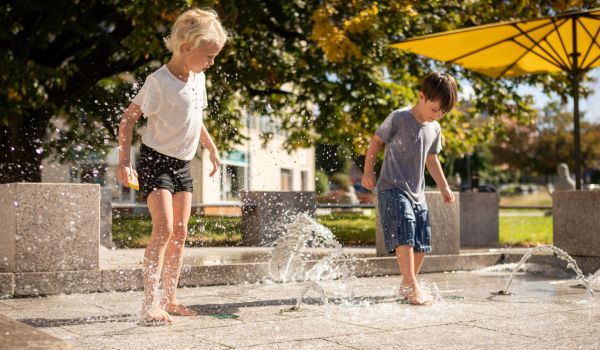 Ein wahres Paradies für kleine Entdecker! Stell Dir vor: An heißen Sommertagen könnt ihr hier planschen, spritzen und euch nach Herzenslust abkühlen. Wasser ist einfach ein Element, das Kinder fasziniert. Erkennt ihr, dass der Wasserspielplatz wie ein zu groß gewordener Baukasten aussieht?