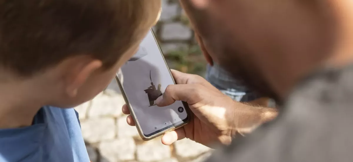 • Wir erzählen Dir auch die Geschichte dazu, lausch‘ rein! Dann kannst Du auf AR „umschalten“ und das Objekt im realen Raum hin- und herbewegen. Lass ein Erinnerungsfoto von dir und dem Objekt machen!
