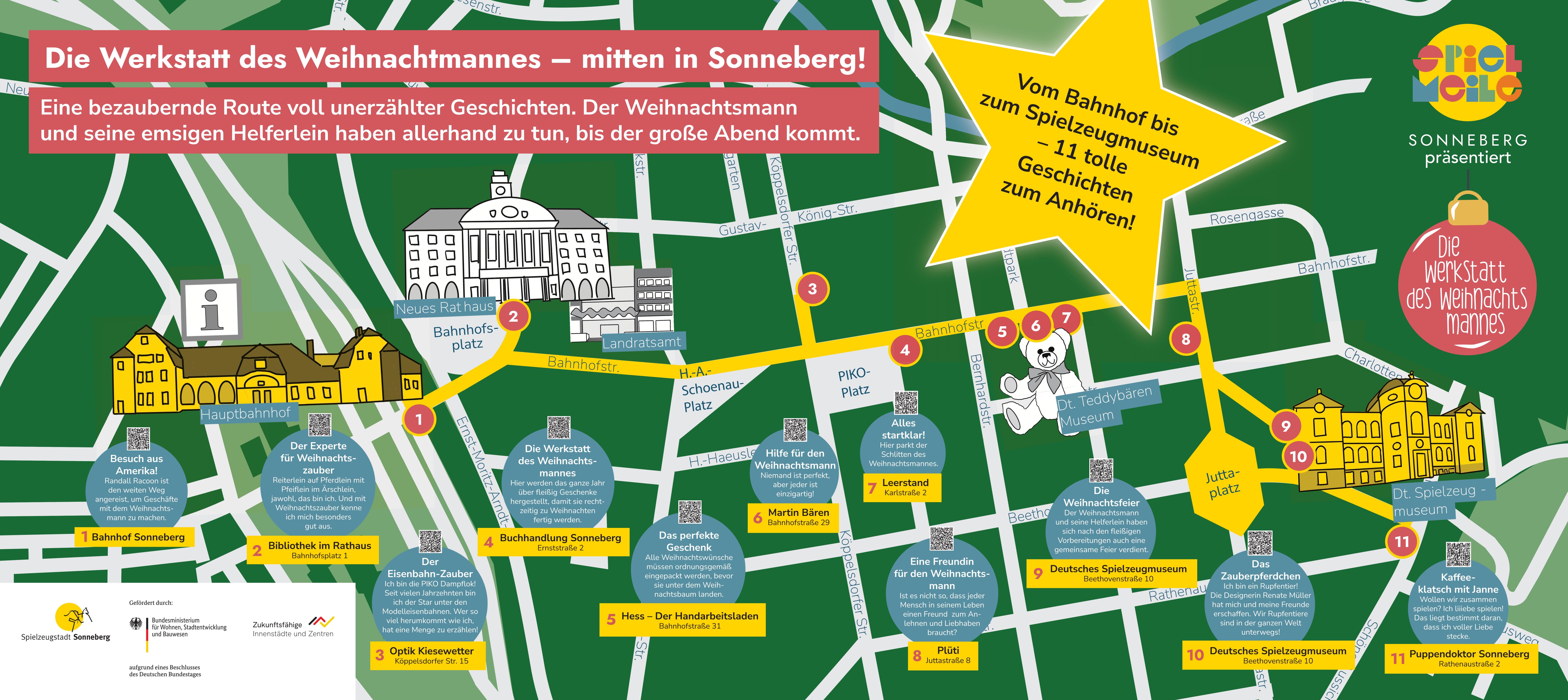 Die Idee und Realisierung dieser lebendigen und zeitgemäßen Inszenierung entstand in der Stadtverwaltung Sonneberg, die sich hierbei Unterstützung für die Visualisierung und die Hörspiele beim Coburger Designforum Oberfranken e.V. gesucht hat. Geschrieben wurden die Geschichten übrigens von der Kinderbuchautorin Anna Madouche und gelesen und produziert vom Schauspieler und Musiker Marcel Wagner.