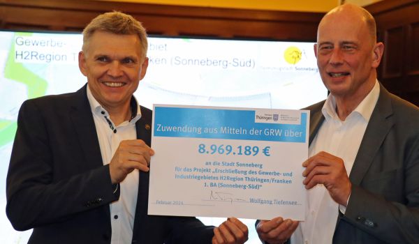 Die Spielzeugstadt Sonneberg erhält Zuwendung aus Mitteln der GRW (Gemeinschaftsaufgabe „Verbesserung der regionalen Wirtschaftsstruktur") von Bund und Land über 8.969.189 € für die Erschließung des Gewerbe- und Industriegebietes H2Region Thüringen/Franken 1. Bauabschnitt (Sonneberg-Süd).