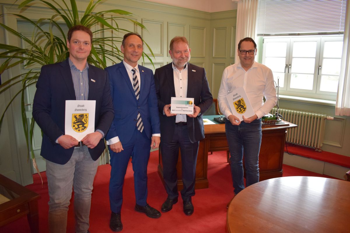 Am Thema Wasserstoff kommt man in Sonneberg längst nicht mehr vorbei. Und auch für den Nachwuchs ist es schon frühzeitig möglich, sich mit diesem Zukunftsthema in der Spielzeugstadt zu beschäftigen. Nicht zuletzt deshalb, weil es ein eigens gegründetes Wasserstoff-Institut in der Spielzeugstadt gibt, welches gut vernetzt ist mit den hiesigen Unternehmen und Bildungsträgern. Was liegt da näher als eine Kooperation mit der MINT-freundlichen Stadt Sonneberg? Dr.-Ing. Ulrich Palzer als Institutsdirektor, Dr.-Ing. Tobias Wätzel als Wissenschaftlicher Leiter und Bernd Hubner, Werkleiter der Wasserwerke Sonneberg, von HySON unterzeichneten Ende März im Rathaus gemeinsam mit dem Hauptamtlichen Beigeordneten Christian Dressel eine Kooperationsvereinbarung mit der Stadt und erhielten im Gegenzug die Plakette als Kooperationspartner der MINT-freundlichen Stadt Sonneberg.