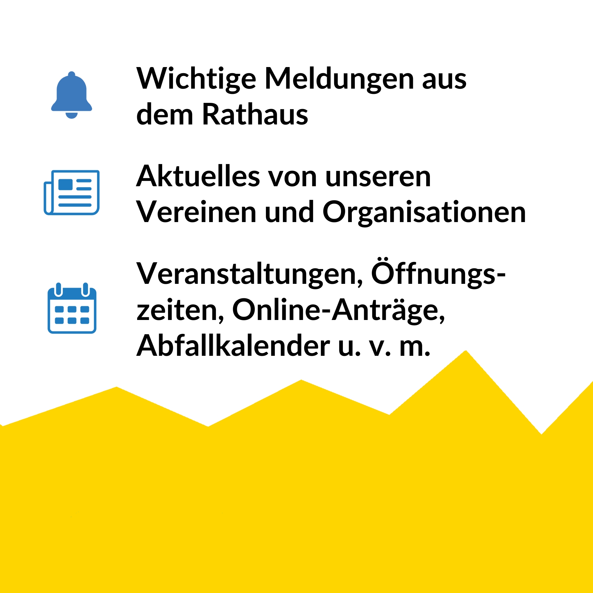 In der Heimat-Info App erhalten die Bürger unter anderem wichtige Neuigkeiten und Aktuelles aus unserem Rathaus. Das enthaltene Bürgerservice-Menü enthält bürgerrelevante Informationen: ob Online-Anträge, Abfallkalender, Öffnungszeiten der Einrichtungen u.v.m..